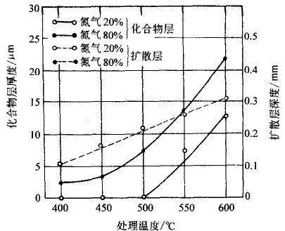 ▲图9 氮氢混合比对离子渗氮化合物层和扩散层深度的影响