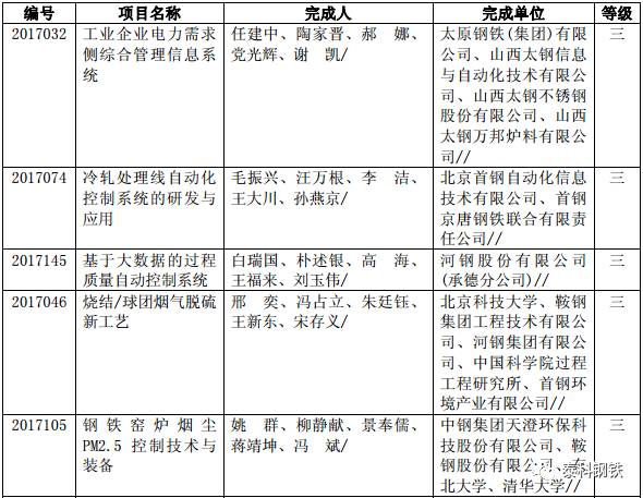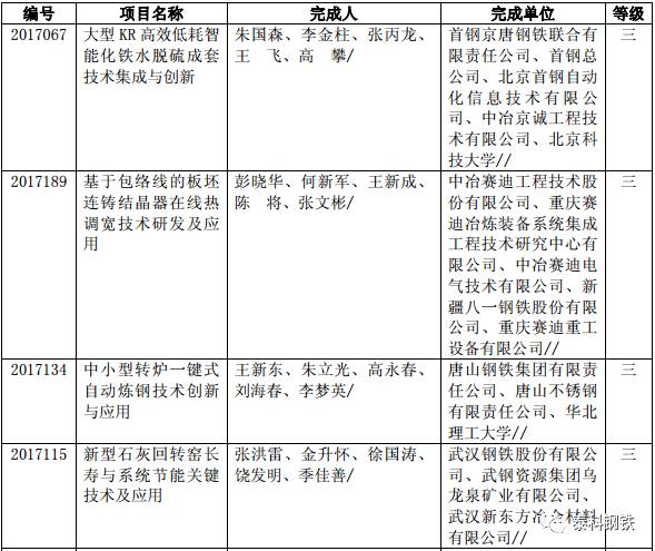 近日,冶金科学技术奖奖励委员会办公室公布了2017年中国钢铁工业协会、中国金属学会冶金科学技术奖(简称冶金科学技术奖)推荐获奖项目名单,并将获奖项目的名称、完成单位、完成人、推荐等级等向社会公告。根据专业评审结果,2017年共推荐获奖项目82项,其中:特等奖3项,一等奖14项,二等奖22项,三等奖43项。冶金科学技术奖是中国冶金行业最高科学技术奖,恭喜各获奖单位和技术大拿们,赶紧来看看都有谁获奖了吧!
