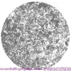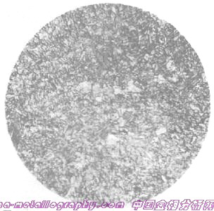 | 图号:35-03 浸蚀剂:4%硝酸酒精 材料及状态:35钢 处理:调质处理 组织及说明:某产品调质处理后心部组织,回火索氏体及白色沿晶界分布的铁素体,硬度为21HRC。 35钢的淬透性较差,当工件截面稍大些,则淬不透,心部组织仍会有铁素体存在。 |