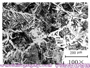 | 图号:35-05 浸蚀剂:4%硝酸酒精 材料及状态:35钢 处理:940℃加热保温3h后空冷 组织及说明:黑色为细片状珠光体,白色为铁素体,铁素体大部分沿奥氏体晶界析出,部分在奥氏体晶粒内成条状或针状析出,呈魏氏组织状态,硬度为198HB。 35钢Ac1为724℃,Ac3为802℃,正常的正火温度应为840~890℃。由于正火温度过高,使奥氏体晶粒长大至3~4级(个别已长大至2级),正火后出现魏氏组织,使零件的脆性增加。为了改善此种组织状态,可以在正常的正火温度重新正火,给予消除。 |