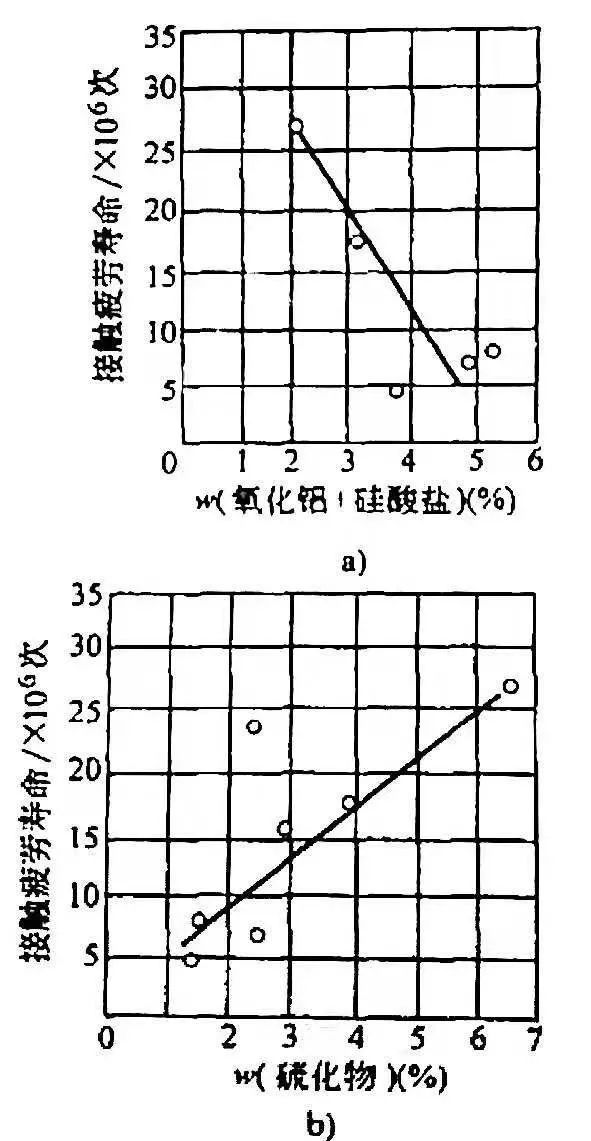 齿轮、凸轮副、滚动轴承、钢轨与轮箍、凿岩机活塞与钎尾的打击端部等,它们的接触面在滚动或滚动与滑动复合摩擦时,接触应力反复作用下引起的表面破坏现象称为“接触疲劳”。零件产生接触疲劳时,接触表面上产生许多针孔或痘状凹坑,称之为“麻点”或“点蚀”,有的凹坑很深,呈贝壳状。在刚开始出现少数麻点时仍可继续工作;随着时间延长,麻点剥落将不断增多和扩大,磨损加剧,将发生较大附加冲击力,噪声增大,甚至使零件折断,这就是接触疲劳现象。 轴承钢中的非金属夹杂物有塑性的、脆性的和不变形(球状)的三种。其中塑性夹杂物对接触疲劳寿命的影响较小,球状夹杂物(即硅酸盐和铁锰酸盐)次之,危害最大的是脆性夹杂物(Al2O3、氮化物、硅酸盐和碳化物等)。因为它们无塑性、与基体间的弹性模量不同,容易在夹杂物和基体交界处引起高度应力集中,二者的膨胀系数差别对应力集中影响很大,从而成为影响疲劳寿命的重要因素。氧化物等夹杂膨胀系数小于基体,使金属界面产生残留拉应力,使得疲劳强度降低;硫化物膨胀系数大于基体,使金属界面产生残留压应力,不仅不降低疲劳强度反而有利于疲劳寿命。硫化物的有利作用还有可能是将氧化物包住,形成共生夹杂物。因此图9 所示为硅酸盐、氧化铝和硫化物对接触疲劳寿命的影响。
