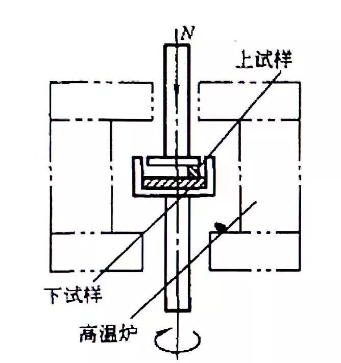 如图13所示,为切入式磨损试验机。方块形 上试样 固定,圆盘形 下试样 转动,在载荷作用下,下试样 切入 上试样,用读数显微镜测量切入磨痕宽度后,计算体积磨损量,可快速测定材料及处理工艺的性质。国产MK-1型,Skoda-Savin型试验机即属此类。