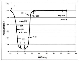 图1 Copson 曲线显示了在含16%~21%铬的铁- 镍- 铬合金中,镍对应力腐蚀阈值应力强度的影响(105℃,22% NaCl 水溶液)。X 和Y 是德国高温合金,444 是一种超纯铁素体不锈钢。此图根据Speidel(1981) 重新绘制。