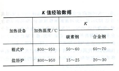 (2)加热时间(s) %26tau;=KD 式中D为工件厚度,mm;K为系数,工厂经验数据如表。