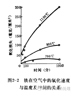 1)加热温度与时间的影响。钢的加热温度越高,原子扩散速度越快氧化越严重。加热时间越长氧化损失也越大,如图2-2所示