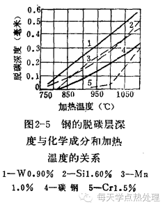 (4)化学成分 钢的含碳量越高,脱碳倾向越大。W、Al,Si,Co等元素使钢脱碳增加;Cr等元素则能阻止钢的脱碳。