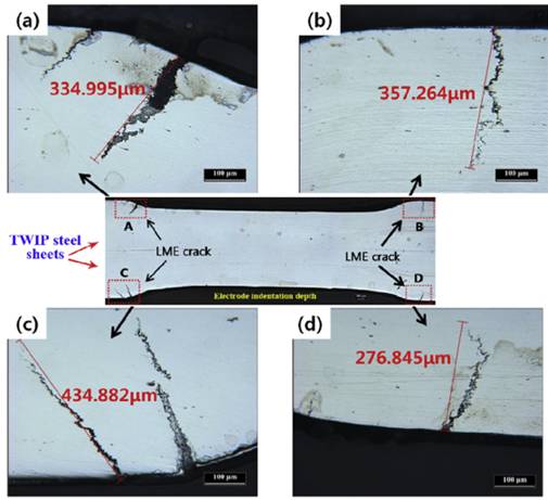 图2 TWIP钢电阻点焊后观察到的LME