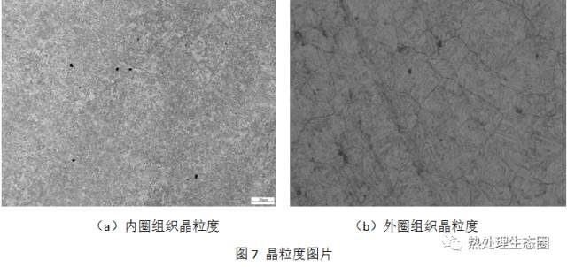 图7a为钢背内圈附近的晶粒度照片,其晶粒为8级,而7b为靠近外圈的晶粒度图片,晶粒为3~4级。同时其内外圈的组织也存在较大差异,如图8所示。