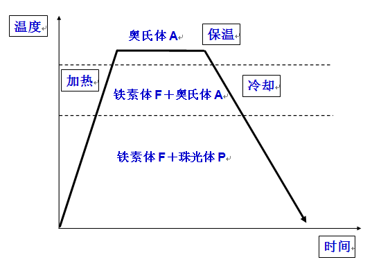 常温组织系F+P,加热温度超过AC1,珠光体P向奥氏体A的转变,继续加热,剩余铁素体F向奥氏体A溶解,直至组织为单一奥氏体A。