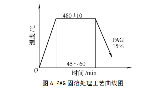 综合生产实际,薄壁深腔零部件采用PAG作为淬火冷却介质进行固溶处理工艺方法,工艺曲线图6所示。
