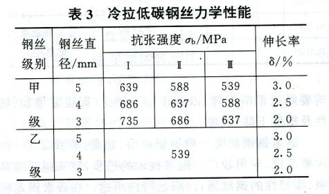 冷拉低碳钢丝 中国的冷拉低碳钢丝由Q235热轧盘条冷拉而成。分甲、乙两个级别力学性能见表3。甲级钢丝用于预应力钢筋,乙级钢丝用于焊接网、焊接骨架、箍筋和构造钢筋。