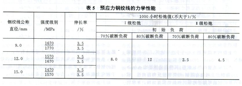 预应力混凝土用钢绞线由中2.5~5.0mm高强钢丝编绞成。根据应力松弛性能分成两级:I级松弛和Ⅱ级松弛。按强度分为1470、1570、1670和1770MPa4个级别,力学性能见表5。