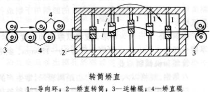 矫直方法有压力矫直、辊式矫直(包括直辊矫直和斜辊矫直)、张力矫直和拉伸弯曲矫直。拉伸弯曲矫直的原理是,当带材在小直径辊子上反复弯曲时给带材施加拉力,使带材产生弹塑性延伸,从而将带矫直。拉伸弯曲矫直机组一般用在连续作业线上矫直各种带材,包括高强度、极薄带材。这种机组也用于连续酸洗板冷却后还可采用平整的方法减少板带的厚度差和矫作业线上的带材机械破鳞,以提高酸洗速度。矫直机的直板形。此外对一些特殊产品要采用特殊矫直,如矫直基本类型和它们的主要用途见表。冷轧薄板或热轧薄薄壁和特薄壁管使用转筒矫直(见图)等。