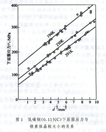 这一对应关系是由Z=2(N+3)变换而来,式中Z为lmm2中的平均晶粒数目,N为晶粒号。由此可得每一晶粒平均所占的面积(截面)及每一晶粒的平均直径。一般工业用钢中,晶粒号通常表示的是奥氏体的晶粒大小,也可特指铁素体的晶粒大小。例如,以铁素体为基体的工程结构钢可特指铁素体的晶粒大小;淬火回火钢则指淬火前奥氏体的晶粒大小。工业用钢细晶粒号的通常范围为N5~10,N%26lt;5称为粗晶粒,N%26gt;10则称为超细晶粒。霍尔一佩奇关系式可描述钢的屈服强度和晶粒尺寸的关系:%26sigma;y=%26sigma;0+Kgd-n4. 式中%26sigma;y为钢的屈服强度;%26sigma;0为常数,大体相当于单晶铁的屈服强度,与温度、成分有密切关系;Kg为表征晶界对强度影响程度的常数,与晶界结构有关,而与温度关系不大;d为晶粒大小,可以是铁素体晶粒大小、奥氏体晶粒大小,也可以是亚晶的大小;指数n4=0.5。例如O.11%碳钢的下屈服应力与铁素体晶粒大小的关系如图1所示。