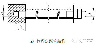 折流板、支持板的固定一般采用拉杆或拉杆和定距管与管板固定。常用的固定结构有两种,即拉杆定距管结构和点焊结构,见图所示: