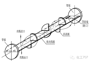 在壳程内安装一平行于换热管轴线的矩形平板,即纵向隔板,将壳程一分为二,即双壳程,见图所示。这种结构可以提高壳程物料流速,改善传热效果,即提高传热系数,从经济角度,一台双壳程换热器比两台单管程换热器便宜。