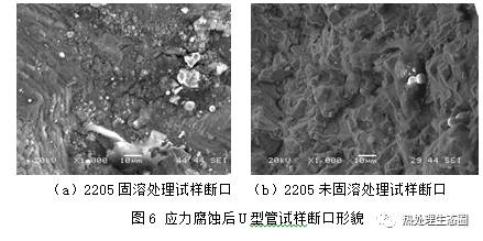 典型试样断口照片见图6。图6得出了具有代表性的SAF2205材质U型管应力腐蚀断口形貌,从图中可以看出,无论是否进行固溶处理,其断裂模式均为经典的脆性断裂,断口表面覆盖有电解质沉积层或结晶球,断口有沿晶开裂这一应力腐蚀开裂特点。材料断口内部出现了分布不均匀的微裂纹,这是明显的穿晶开裂的特征。采用固溶处理以后,断口出现了明显的云纹堆积,有效的增大了断裂纹扩展的路径,穿晶开裂裂纹明显减小,这是固溶处理后U形管耐应力腐蚀能力提升的主要原因;此外,经固溶处理后,奥氏体不锈钢断口处晶粒分布更加均匀,其组织内的缺陷明显减少,在断口处出现了少量验证韧性断裂的韧窝,这是其性能提升的次要原因,该现象与奥氏体不锈钢经固溶处理后出现相态转变和相区分布改变有关。