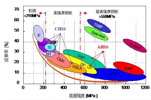 按照钢的力学性能,可分为冷成形用低碳软钢(如,IF钢),传统高强钢(如,低合金高强钢),相变强化高强钢(如,双相钢,QP钢等);这个分类方式在汽车钢中最为常见,我们喜闻乐见的香蕉图就是典型的分类图。