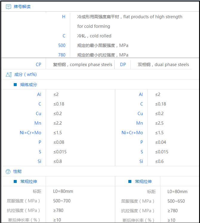 如,HC500/780DP和HC500/780CP这两个牌号,虽然力学性能非常接近,但是由于钢种不同,内部组织也不同。仅根据质保书信息判断,使用DP钢来替代CP钢的话,容易在加工过程中出现翻边开裂的问题。