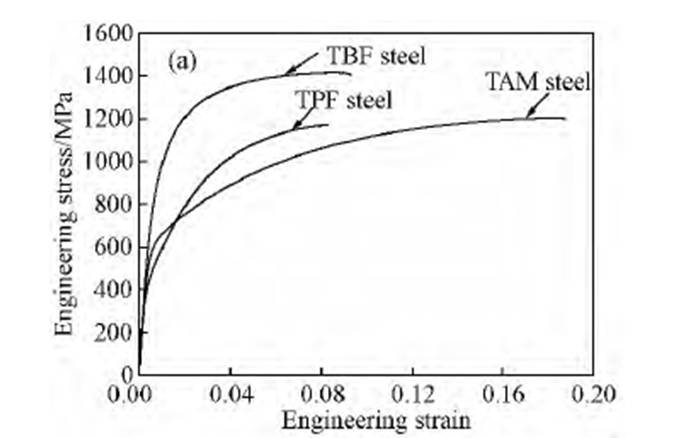 TBF钢在应变初始阶段时应力就迅速增加,这主要是由于TBF钢的基体结构为强度很高的贝氏体铁素体组织,在变形初期即产生较强的加工硬化,在应变达到0.02后由于变形所引起的应力集中,诱发贝氏体铁素体板条间的残留奥氏体发生马氏体相变,使集中的应力得到释放,斜率变缓,抗拉强度可达到1400MPa以上。