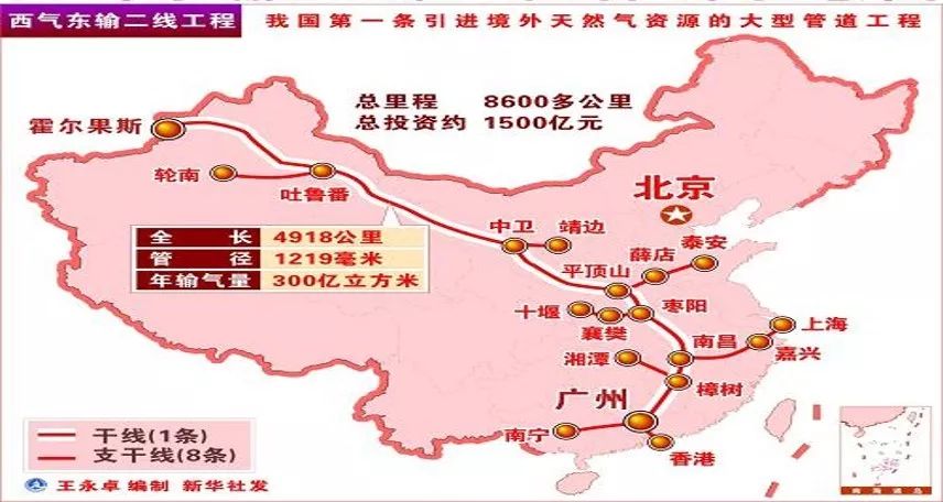 •全长 / 管径 / 压力 : 4200km / 1016mm /10MPa •年设计输量 : 120亿㎥/年 -170亿㎥/年(2009) • 途经 : 新疆、甘肃、宁夏、陕西、山西、河南、安徽、江苏、上海、浙江十个省市区• 全长 / 管径 / 压力 : 4918km (干线)/ 1219mm /10MPa• 途经 : 新疆、甘肃、宁夏、陕西、河南、湖北、江西、湖南、广东、广西等14个省区市• 所属公司 : 中石油 • 特点 :3座 储气库•全长 / 管径 / 压力 : 5220km (干线)/ 1219,1016mm / 10MPa• 年设计输量 : 300亿㎥/年 (进口:250,新疆煤制天然气:50) • 气源 : 新增土库曼斯坦、乌慈别克斯坦、哈萨克+国内