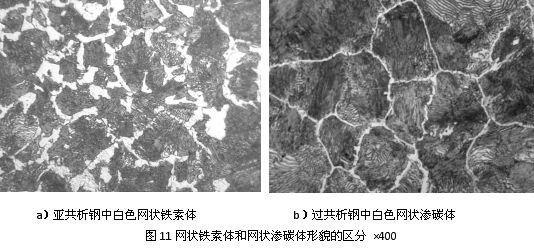 钢铁材料组织形态与材质、工艺、性能之间关系的研究是人们百年来为之努力不懈的一大课题。 而组织形貌的识别、分析(即金相分析)是一门实践性很强的学科,需要实践经验及借鉴、参考。 但是,由于很多材料不同处理状态的显微组织非常相似,比如网状铁素体和网状二次渗碳体、针状铁素体和针状渗碳体、马氏体及其回火产物(回火马氏体、回火托氏体、回火索氏体)、未溶铁素体和先共析铁素体、淬火托氏体和回火托氏体、铁素体和残余奥氏体、低碳板条马氏体和羽毛状上贝氏体、高碳片状马氏体和针状下贝氏体等等。 尽管电子显微镜能准确判断并区分,但生产实际要求的快速检验往往不允许,这就给显微组织的检验工作带来一定困难。如何利用光学显微镜、硬度计等常规仪器,准确快速地判断显微组织就显得尤为重要。 其实很多显微组织只要认真仔细的观察比对,会在光镜下发现其独立的特征。 长期的观察表明,充分利用光学显微镜、硬度计等普通装备,在理论分析和相互比较的基础上,快速准确地鉴别不同材料或同种材料不同处理状态下的显微组织是可行的,而且有很强的现实性和可操作性。 以下是钢材中常见的几种相似显微组织及其鉴别方法,希望能给予从事金相检验教学及生产检验的金相工作者以帮助。 铁素体与渗碳体的鉴别 钢材在热加工过程中,往往会出现网状铁素体和网状二次渗碳体以及针状铁素体和针状渗碳体。 如果奥氏体晶粒较大,含碳量较高,冷却速度较慢时,先共析铁素体沿奥氏体晶界呈网状析出;如果奥氏体晶粒粗大,冷却速度适中,碳的质量分数在0.15%~0.5%范围内的钢,先共析铁素体沿某些晶面析出,呈片状或(针状),这种组织称为魏氏组织。 在过共析钢中先共析渗碳体的形态一般是网状或片状(针状),无块状渗碳体。网状渗碳体同样是冷却速度较慢时形成的,而针状渗碳体(即魏氏组织)是碳的质量分数为1.1%并在适当的冷速下产生的。 先共析铁素体和先共析渗碳体在4%的硝酸酒精溶液侵蚀后都是白色。可用以下方法鉴别两种形态比较相似的白色网状(或针状)铁素体和渗碳体组织。 1.显微观察法 如果白色网状组织比较粗大,粗细不均匀,还能清楚看到网状组织中黑色细而均匀的线条(即晶界),可以判断该组织为铁素体,材料为亚共析钢,如图11a所示为45钢Φ13.2mm棒料横截面中的组织,由白色网状铁素体和索氏体组成;如果白色网状组织很细很均匀,则可判断为网状二次渗碳体,材料为过共析钢,如图11b所示为T12钢完全退火后的组织,由沿晶界析出的白色网状二次渗碳体和片层状珠光体组成。 ▼ 2.显微硬度法 这种方法适用于较粗大的白色网状情况。一般选用较小载荷的显微硬度测量,所测之值在600HV以上者可确定为渗碳体相;所测之值在200HV以下者则确定为铁素体,并可判定认为是亚共析钢。 3.化学试剂浸蚀法 对于细网状组织,采用碱性苦味酸钠水溶液,将被测试样浸入其中煮沸5min左右,取出试样以流水冲洗干净,然后吹干,放在显微镜下观察,若白色网变为黑棕色或更深的黑色,则确定为渗碳体相;若其颜色不变仍呈白色(不受侵蚀),则认为是铁素体。 4.硬针刻划法 这是最简单易行的一种方法。只要有一台光学金相显微镜就可进行。 首先将样品制成金相试样,并进行普通的侵蚀,然后在其上刻划一条痕迹,放到显微镜下观察,若刻划的痕迹变粗,则认为白色为铁素体。反之刻痕较细或方向发生变化,则认为是渗碳体相,如图12a所示为T8钢1200℃加热保温5min20s,先700℃等温2.5min再600℃等温2min后水淬的组织,由于淬火加热温度特别高,使T8钢产生了严重的脱碳,在随后的冷却过程中得到了白色网状和针状铁素体、深色托氏体及针状铁素体间的灰色板条状马氏体;如图12b所示为T12钢1150℃渗碳后正火的组织,为粗大白色针状和网状渗碳体及深色索氏体。 ▼