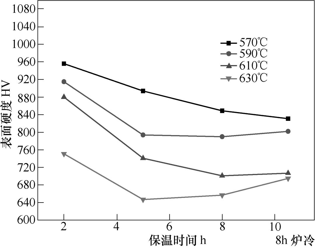 图1为不同温度和时间下退氮处理后表面硬度对比。可以看出,在高于570℃的温度退氮处理后表面硬度均有不同程度的下降;温度越高,硬度下降越多;随时间增加,硬度从2~5h硬度下降明显,5h以后硬度变化趋小;温度的影响要比时间大,630℃×2h处理的效果比570℃×8h效果更显著。另外,可以看出保温8h空冷和炉冷试样表面硬度相差不大,说明冷却方式对退氮后表面硬度影响不大。
