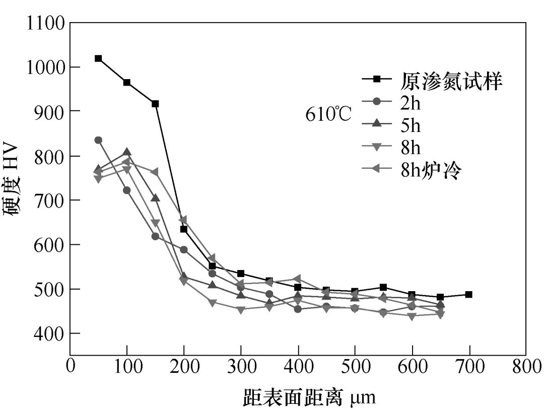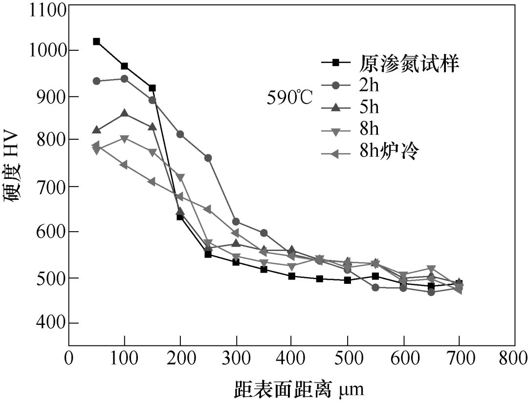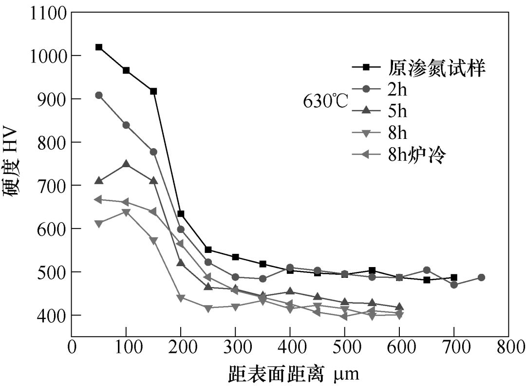 对于570℃和590℃处理的试样,从离表面距离0.25mm向里,其硬度的下降有所缓和,并超过了处理前渗氮的硬度值。退氮不仅使氮原子向外扩散,而且伴随着向内扩散,表层硬度下降的同时,渗层内部硬度增加。对于610℃和630℃,渗氮层0.25mm以后的硬度都低于了原渗氮试样,虽然氮原子向内扩散,但由于加热温度高于试样回火温度,使基体软化,导致渗层硬度下降。