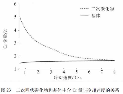 钢中析出的网状碳化物的形态由完整连续网状 逐渐变化为断裂的点条状形貌。二次网状碳化物厚 度随着冷却速度的变化示于图 22,同时可测定 A 晶 粒逐渐细化。冷却速度为 2 和 8 ℃ /s 时的厚度分别 是0.42 和 0.19 μm,对应的形貌为完整的连续网状二次碳化物和断裂的点条状碳化物。另外,二次网 状碳化物和基体中含 Cr 量都随着冷却速度改变,按 能谱分析变化近似示于图 23,相应与 Cr 的扩散( 在不同温度和不同时间下) 相关。冷速以 1 ℃ /s 冷至 室温时,二次网状碳化物中和基体中的含 Cr 量分别 为4.09% 和 1.55% ,相差 2.64 倍; 冷速以 5 ℃ /s 和 8 ℃ /s 冷至室温时,二次网状碳化物和基体中的含Cr 量分别为 1.90% 、1.62% 和 1.70% 、1.70% 。