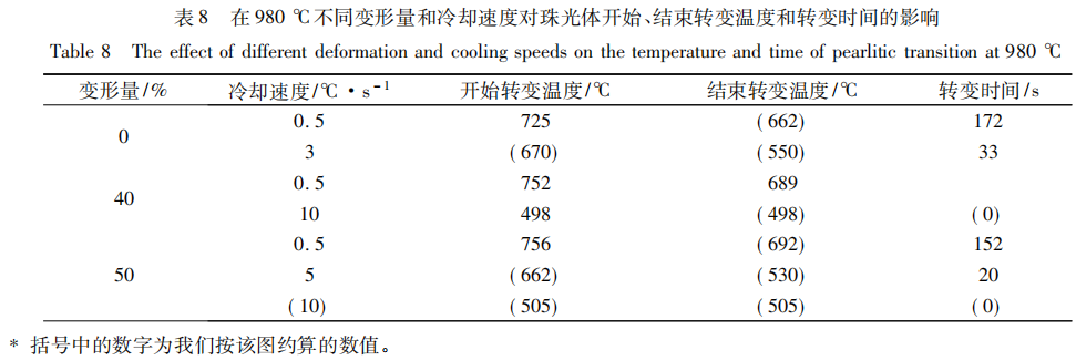 图 25 十分明确指出,在一定的变形量下,随着冷却曲线的冷速增大,珠光体转变的开始和结束转变温度降低; 在一定的冷速条件下,随变形量增加, 珠光体转变的开始和结束转变温度出现升高趋势, 如表 8 表示。得到珠光体组织的片间距 d 和 HV 硬度和冷速关系示于图 26。