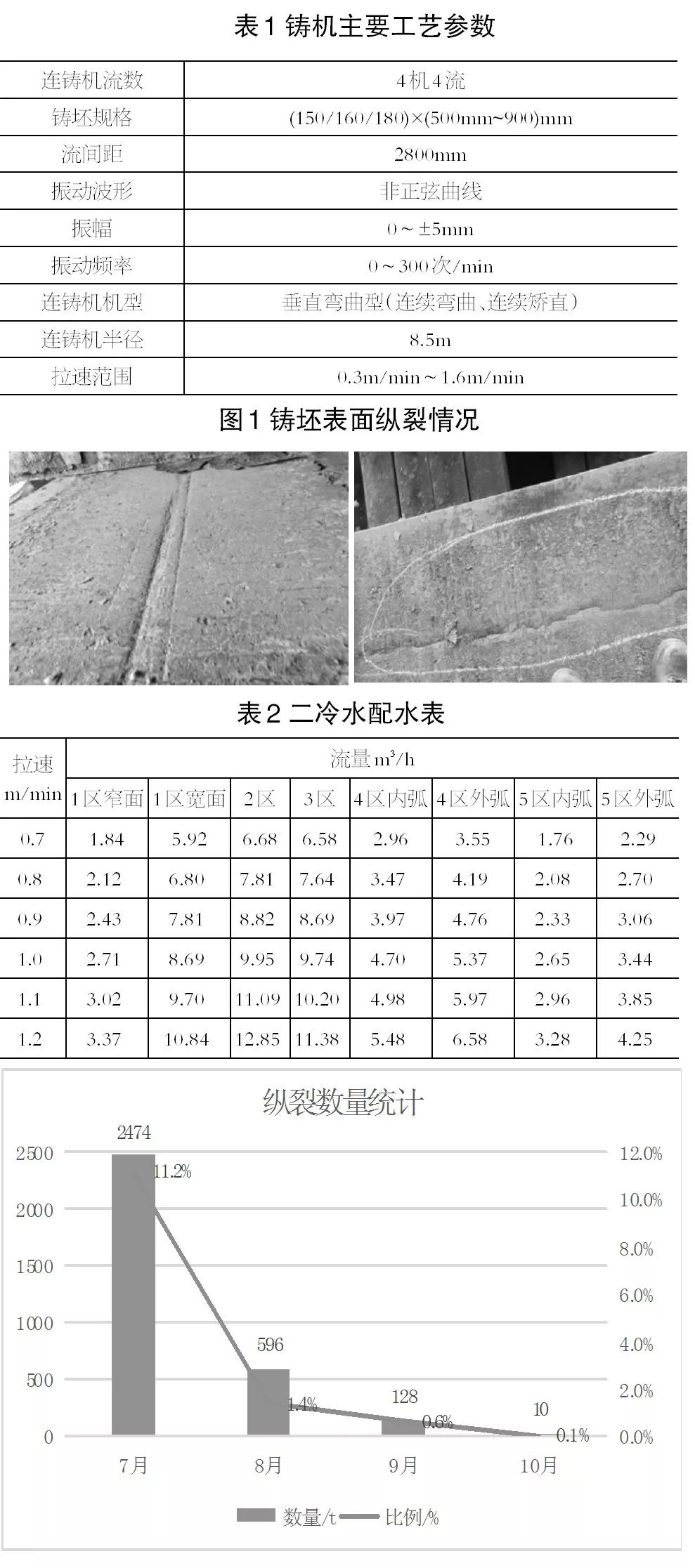 作为上游工序的板坯连铸,能否生产出高质量的铸坯,是该生产线能否成功投入的先决条件,产品主要以Q235、Q195等钢种为主,Q235是典型的包晶钢,在投产之初板坯表面出现严重纵裂,在有意避开包晶敏感区之后,此类裂纹依然存在,说明裂纹的产生不仅仅是包晶反应的影响,还有其他重要的影响因素存在,三宝钢铁针对可能的影响因素逐个改善,最终将纵裂问题彻底解决。板坯连铸的连铸机主要工艺参数如表1所示。