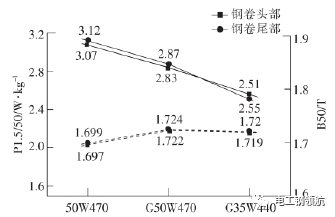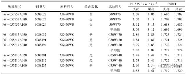 3) 常化对钢卷的电磁性能有利,而产品厚度越薄,磁性能也有所改善,铁损进一步降低。