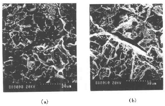 图10-6(a)是筛板纵向断口(断口表面与钢板表面平行)扫描电镜照片。由图中可见断口以沿晶型断裂为主,晶界上有较多的颗粒状夹杂物。图10-6(b)为与钢板表面垂直的横向断口。该断口是沿晶与准解理混合断口。在断口上可以明显地观察到沿轧向分布的粗大夹杂物,在夹杂物的两侧及两端均有裂纹存在。