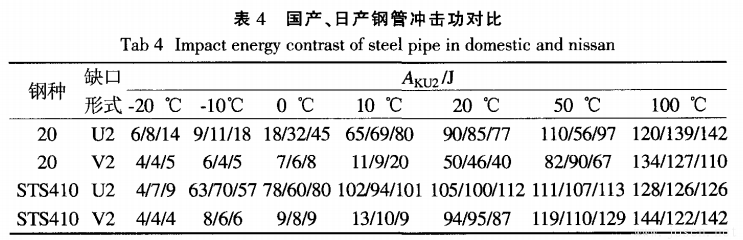 大量力学性能对比实验验证20钢管不经正火处理会有一定的安全隐患,如江苏某钢管厂生产的20(交货状态为正火)和日本某公司生产的STS410(交货状态为轧态)Ф219mm×35mm做V型、U型缺口冲击实验,结果见表4。