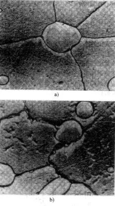 图5 a)是中间没有停留,奥氏体化后直接水冷,可以看到没有析出物,晶界很清晰。图5 b)是从1190℃冷却到980℃,停留了30s,可以看到晶界及基体内都明显的有小颗粒状碳化物析出。