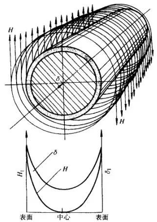 当交变电流在导体中通过时,在所形成的交变磁场作用下,导体内会产生感应电动势。由于越接近心部,感应电动势越大,导体的电流便趋向于表层,电流强度从表面向心部呈指数规律递减,如图1 所示。这种现象即所谓交变电流的集肤效应。