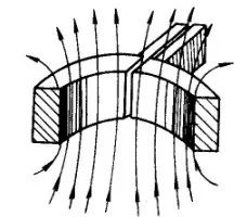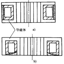 加热外表面,环状效应是有利的,而加热平面与内孔时,它会使感应器的电效率显著降低。为了提高平面和内孔感应器的效率,常常设置导磁体,以改变磁场强度的分布,迫使电流趋近于零件所需加热的表面,见图4 。由图可见,导磁体有把电流驱向其对侧的作用。