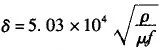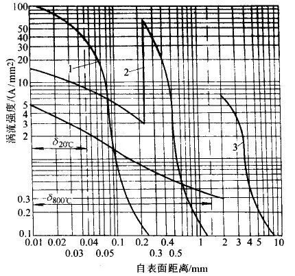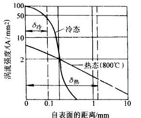 磁场强度分布的基本方程表明,涡流强度随表面距离的变化呈指数规律。涡流高度集中在表层中,它随距离的增大而急剧下降。在工程应用中,规定 Ix 降至表面的 1/e (e=2.718) 处为电流透入深度,并用δ表示。如果 ρ 的单位为 Ω·cm ,则可用下式求 δ(mm)