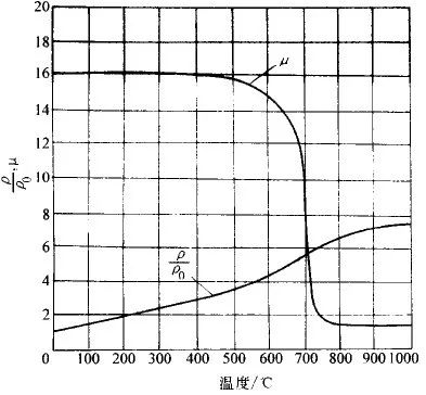 钢铁材料的电阻率 ρ 在加热过程中随温度的升高不断增加(在800-900℃范围内,各种钢的电阻率基本相同,约为10E-4 (Ω·cm);磁导率 μ 在失磁点以下基本不变(其数值与强度有关),但在达到失磁点时,突然下降为真空的磁导率 μ=1。见图6 。因此,当温度到达失磁点时,涡流的透入深度将显著增大。超过失磁点的涡流透入深度称为“热态透入深度”。低于失磁点时称为“冷态涡流透入深度”。