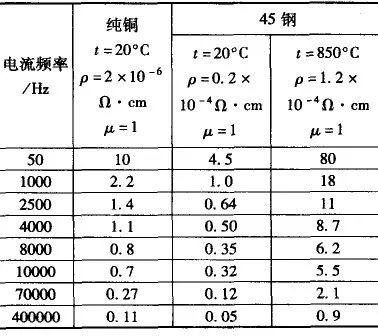 表2 和表3 列出了在各种频率下的电流在纯铜与45钢冷态与热态中的涡流透入深度。