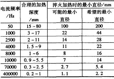 表4 是根据上述关系所要求的电流频率与所对应的被加热工件最小直径和合理的淬火深度范围。