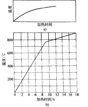 在分析示波器记录的钢在感应加热时的温度-时间曲线(图10)时得知,钢铁材料在失磁后,加热速度下降数倍,这是感应加热的特性。