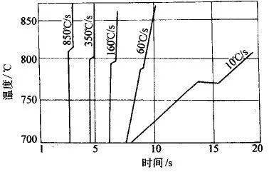 ▲图12 w(C)0.85%的钢在各种加热速度下的温度-时间曲线