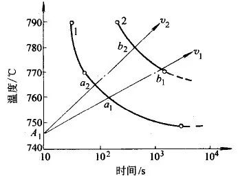在连续加热的条件下,珠光体向奥氏体转变动力学也可用图3 来说明。由A1 点出发的不同仰角的射线表示相变区的各种不同的加热速度。他们分别与曲线1和曲线2相交于 a1、b1......和a2、b2......显然,加热速度越大(v2>v1),进行相变的温度就越高,而所需要的的时间就越短。