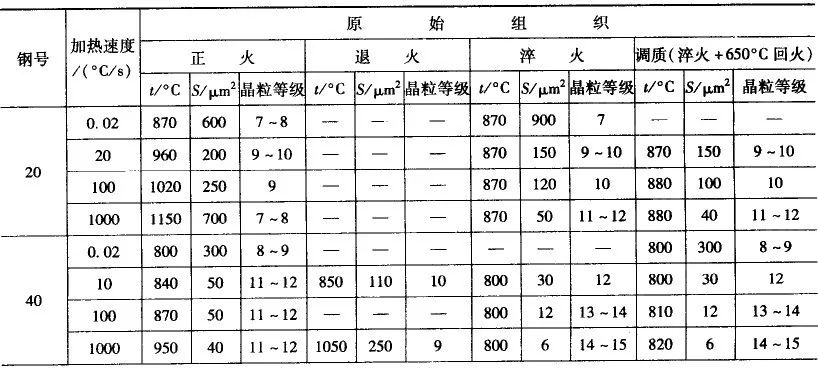 在生产中采用大于3~10℃/s 的加热速度可得到11~12 级的奥氏体晶粒。如果要得到 14~15 级的超细晶粒,必须先进行淬火或调质处理以消除自由铁素体,并采用高达100~1000℃/s 的加热速度。