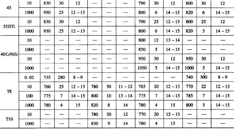 实践证明,对具有均匀分布的铁素体和渗碳体组织的钢进行快速加热时,当加热速度由0.02℃/s 增高到100~1000℃/s 时,初始奥氏体晶粒度由 8~9级细化到 13~15 级。加热速度为10℃/s 时初始奥氏体晶粒度为11~12 级。要得到14~15级的超细化晶粒必须采用100~1000℃/s 加热速度,见表6 。