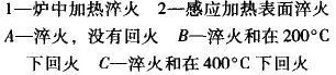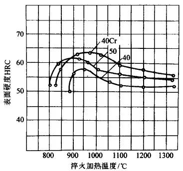 对相同材料,经过感应加热表面淬火(喷射冷却)后,其硬度比普通加热淬火的高2~6HRC(见图17)。这种现象称为 “超硬度”。