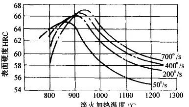 感应加热表面淬火时,在一定的加热速度下,可在某一相应的温度下获得最高硬度,见图15 。提高加热速度,这一温度向更高的方向推移,见图16 。