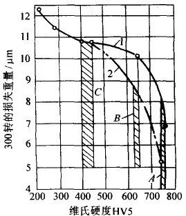 零件工作时的磨损量在很大程度上取决于硬度。对同样的材料,高频淬火零件的耐磨性比普通淬火零件高得多(见图18)。