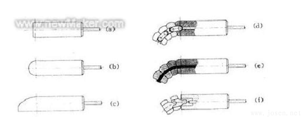 芯棒的形状是多种多样的,对于具有不同相对弯曲半径或相对壁厚的管件,以及对其加工要求的不同,应选用不同的形状芯棒。一般情况下,可将芯棒分为两大类:一种为硬式芯棒(见图3a、b、c),一种为软式芯棒(见图3d、e、f)